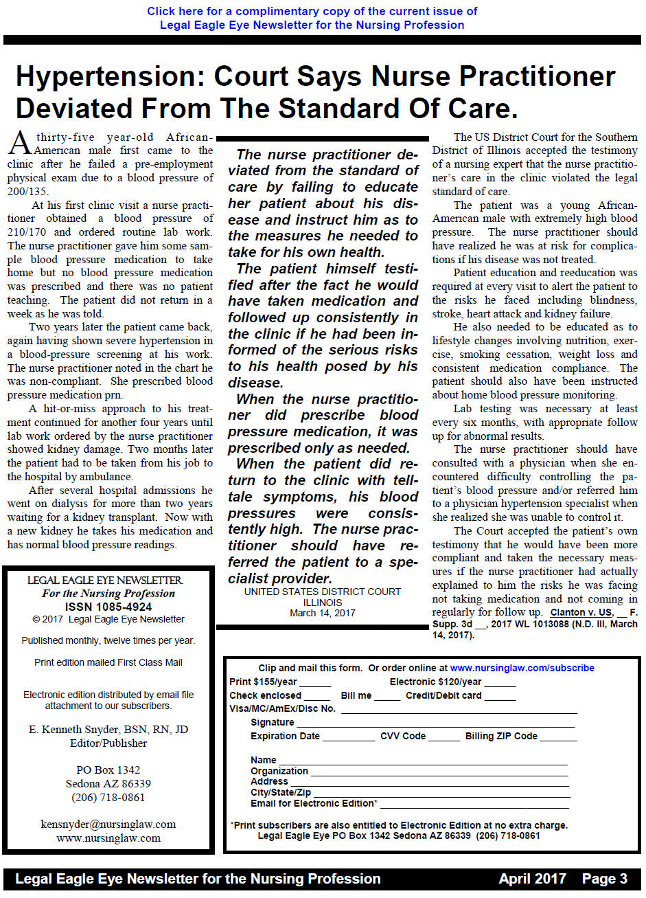 The US District Court for the Southern District of Illinois accepted the testimony of a nursing expert that the nurse practitioner’s care in the clinic violated the legal standard of care. The patient was a young African-American male with extremely high blood pressure. The nurse practitioner should have realized he was at risk for complications if his disease was not treated. Patient education and reeducation was required at every visit to alert the patient to the risks he faced including blindness, stroke, heart attack and kidney failure. He also needed to be educated as to lifestyle changes involving nutrition, exercise, smoking cessation, weight loss and consistent medication compliance. The patient should also have been instructed about home blood pressure monitoring. Lab testing was necessary at least every six months, with appropriate follow up for abnormal results.