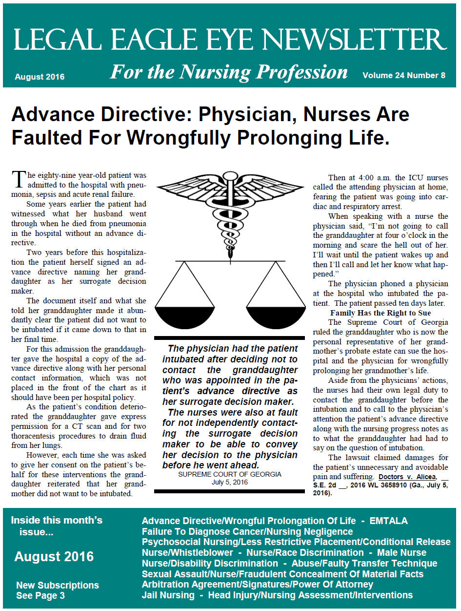 LEGAL EAGLE EYE NEWSLETTER For the Nursing Profession Request a complimentary copy of our current newsletter What is our mission? What publication formats are available? How do I start a subscription? Can I cancel and get a refund? Does my subscription renew automatically? |