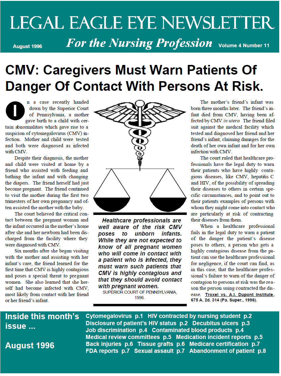 Healthcare professionals are well aware of the risk CMV poses to unborn infants. While they are not expected to know of all pregnant women who will come in contact with a particular patient who is infected, they must warn such patients that CMV is highly contagious and that they should avoid contact with pregnant women. SUPERIOR COURT OF PENNSYLVANIA, 1996.