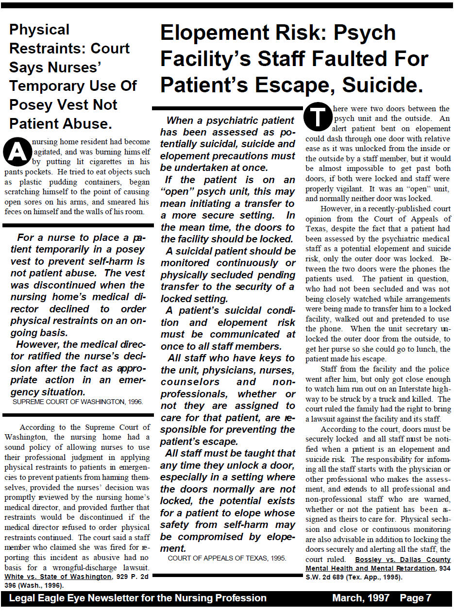 According to the court, doors must be securely locked when a patient is an elopement and suicide risk. All staff must be informed when a patient is an elopement and suicide risk. The responsibility for informing all the staff starts with the physician or other professional who makes the assessment, and extends to all professional and non-professional staff who are warned, whether or not the patient has been assigned as theirs to care for. Physical seclusion and close or continuous monitoring are also advisable in addition to locking the doors securely and alerting all the staff, the court ruled.
