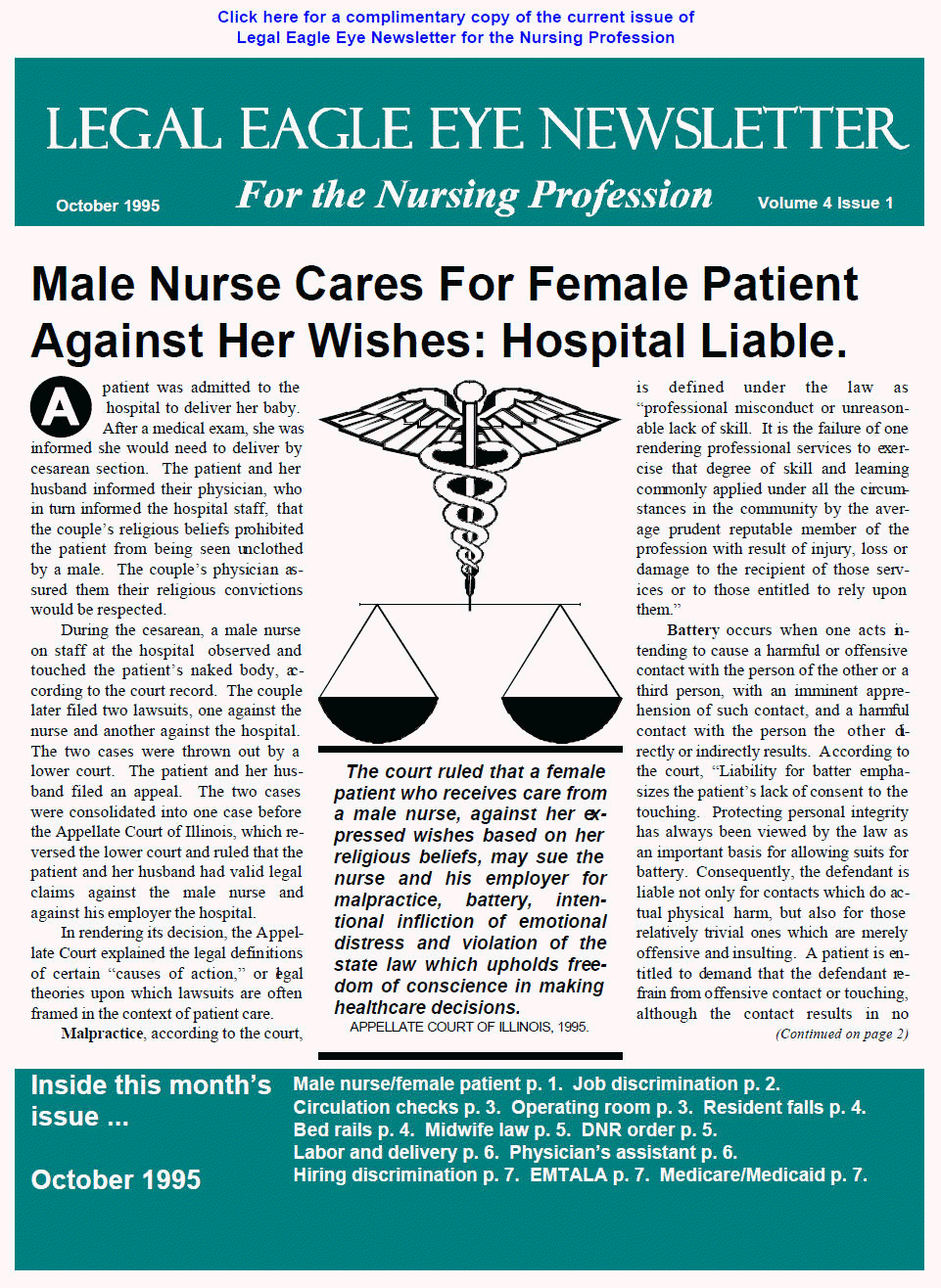Quick Summary: A female patient who receives care from a male nurse against her expressed wishes based on her religious beliefs, may sue the nurse and his employer for malpractice, battery, intentional infliction of emotional distress and violation of the state law which upholds freedom of conscience in making healthcare decisions. APPELLATE COURT OF ILLINOIS, 1995.