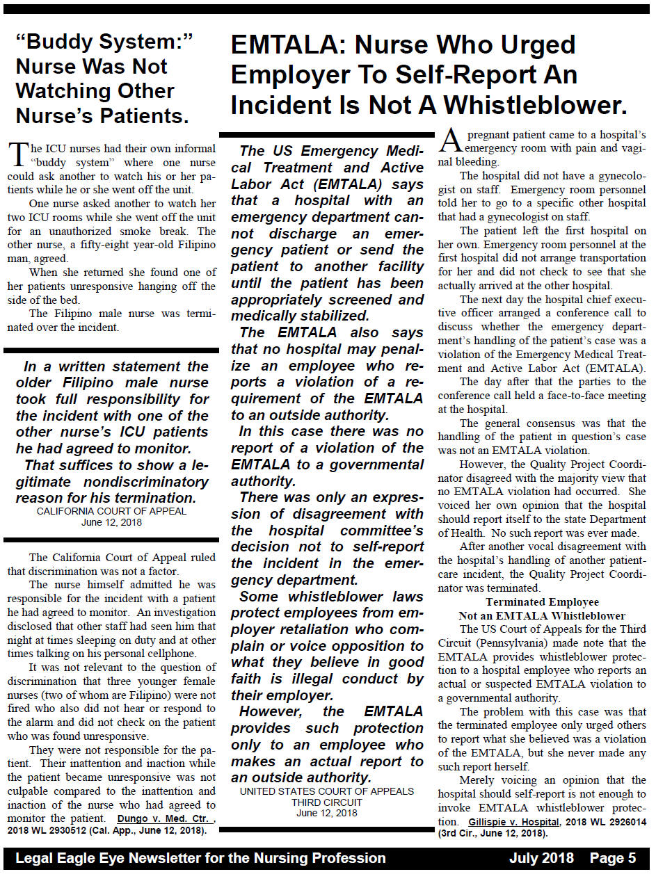 The US Court of Appeals for the Third Circuit (Pennsylvania) made note that the EMTALA provides whistleblower protection to a hospital employee who reports an actual or suspected EMTALA violation to a governmental authority. The problem with this case was that the terminated employee only urged others to report what she believed was a violation of the EMTALA, but she never made any such report herself. Merely voicing an opinion that the hospital should self-report is not enough to invoke EMTALA whistleblower protection. Gillispie v. Hospital, 2018 WL 2926014 (3rd Cir., June 12, 2018).
